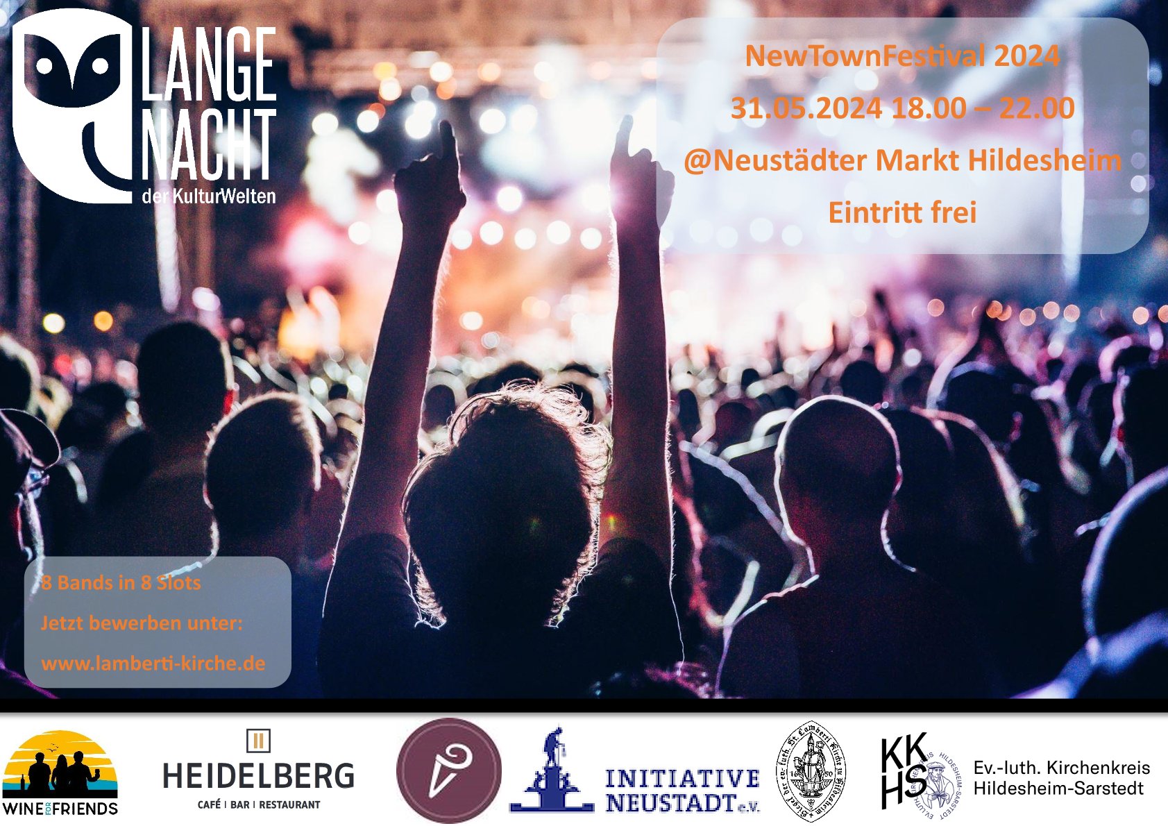 Am Freitag, 31. Mai, wird das NewTownFestival auf dem Neustädter Markt Teil der Langen Nacht der Kulturwelten in Hildesheim sein. Veranstalter ist die St. Lamberti-Kirchengemeinde, Organisator Mario Ehrenberg-Kempf, Kirchenkreiskantor für Popularmusik. Zwischen 18 und 22 Uhr gibt es Live-Musik. Das Café Heidelberg, das Eiscafé Elena Schneider und Wine for Friends sind mit gastronomischen Angeboten dabei. Als zusätzliche Sitzgelegenheiten für das Publikum werden auf dem Parkplatz Bierbänke aufgestellt, für den Verkehr ist der Platz an dem Abend gesperrt.
