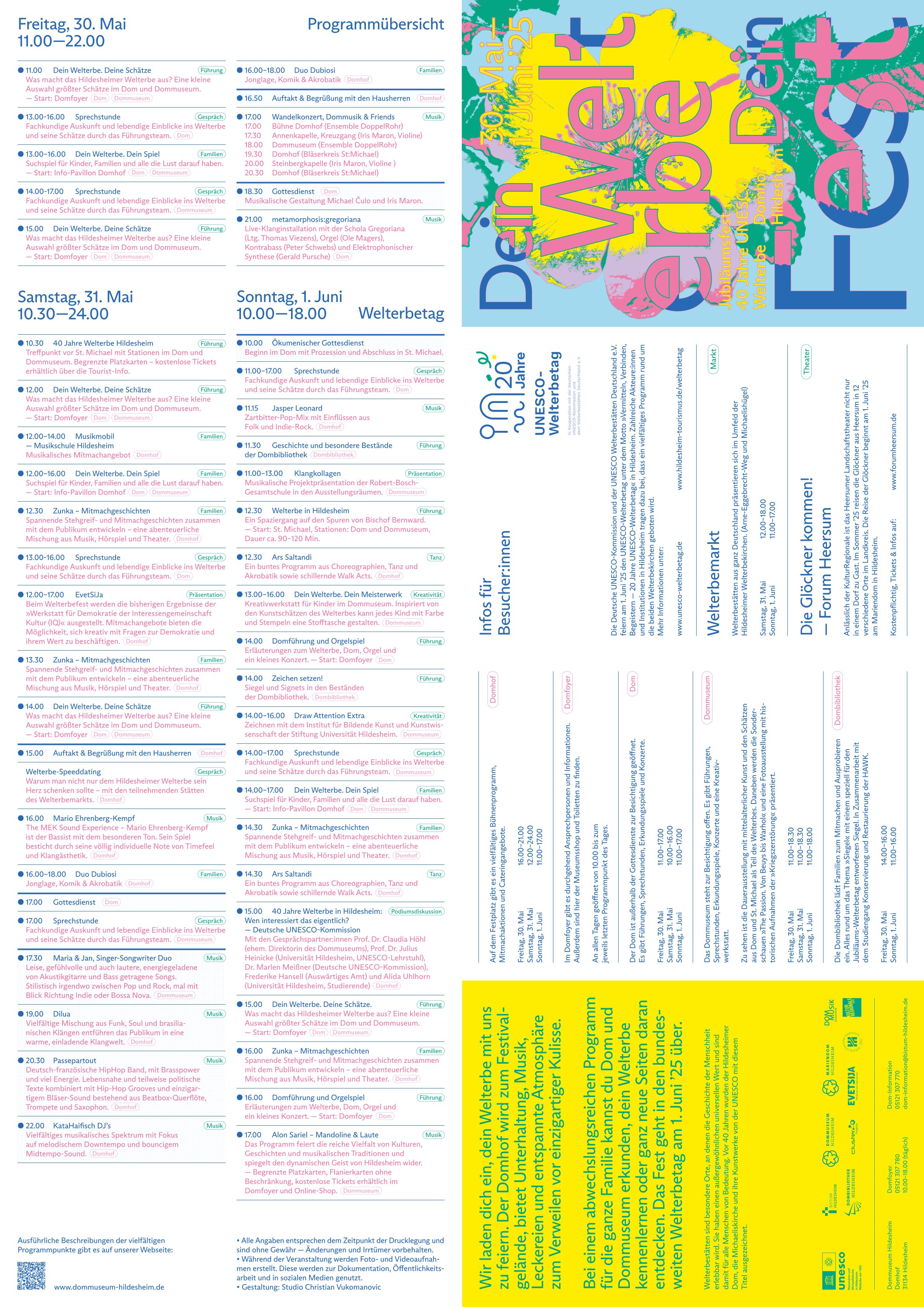 Der Domhof wird zum Festivalgelände mit vielfältigem Programm von Konzerten, Führungen, Vorträgen bis hin zu Mitmachstationen für die ganze Familie. Das Festprogramm geht in den bundesweiten Welterbetag am 1. Juni über. Entsprechend dem Welterbegedanken soll eine einladende und offene Atmosphäre entstehen, die allen Menschen die Teilhabe an diesem besonderen Ort und dem kulturellen Erbe ermöglicht. Alle sind eingeladen!
