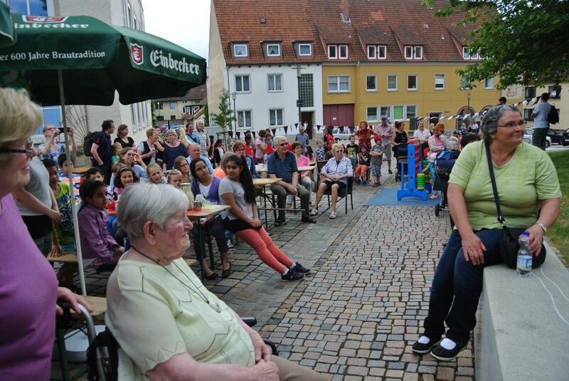 Als finde auf dem Platz vor dem Michaelisheim ein riesiges Kaffeekränzchen statt: Das Märchenfest am Bücherschrank. Foto: Spilker