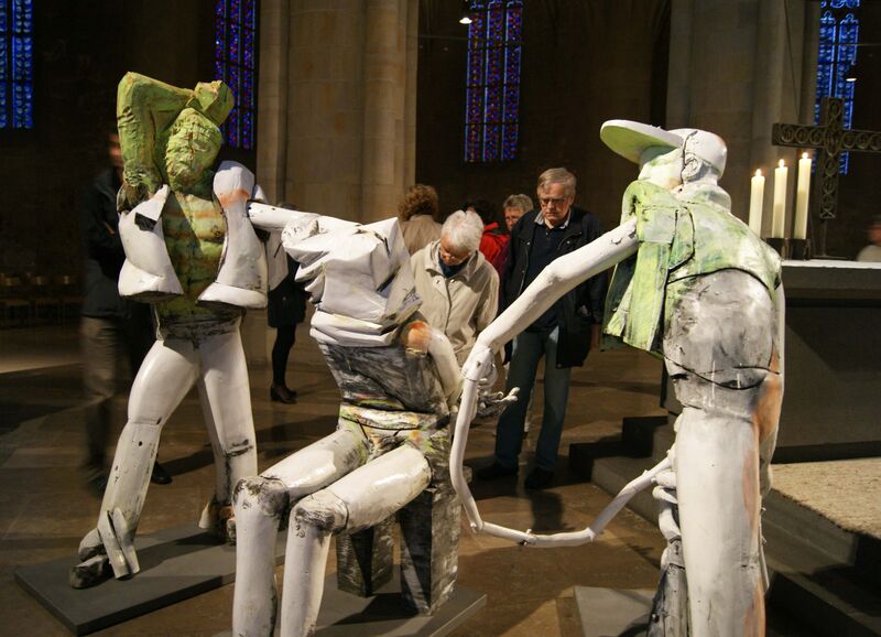 Der Künstler ist für die Eröffnung der Ausstellung selbst angereist und hat die sieben Figuren im Altarraum angeordnet. Ein Mann bläst die Tuba, er richtet sein Instrument dabei direkt auf die Gemeinde. Eine Frauenfigur mit Kamera steht gerade dort unterhalb der Szene, von wo sich das Ensemble tatsächlich gut fotografieren ließe. Ein kleines Mädchen hält sich im Hintergrund. Ein Hund bellt die Szene an, ihn hat Klaus Effern nicht zufällig direkt neben der Kanzel aufgestellt. Im Zentrum steht eine Dreiergruppe mit dem Verspotteten und Gefolterten in der Mitte.