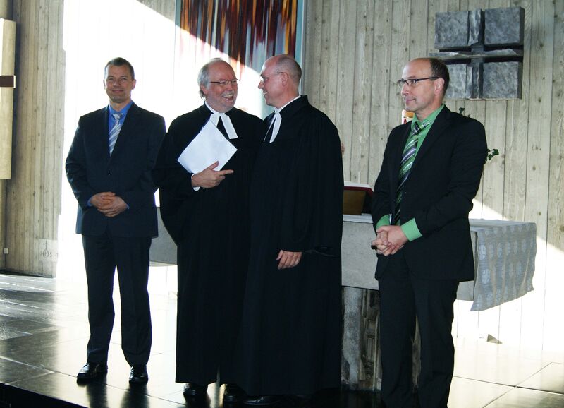 Gemeinsam mit Superintendent Helmut Aßmann und den Kirchenvorstandsvorsitzenden Holger Schaper (links) und Dr. Jens Clausen (rechts) genießt Pastor Jürgen Plötze (Zweiter von links) den Applaus der Gemeinde.
