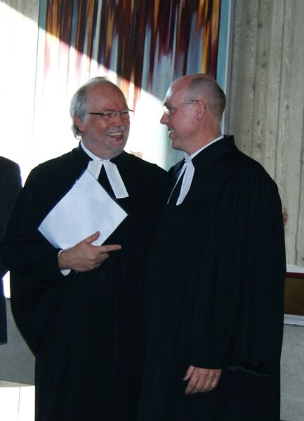 Ein herzliches und gelöstes Lachen nach der offiziellen Entpflichtung: Pastor Jürgen Plötze und Superintendent Helmut Aßmann.