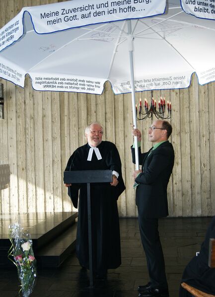 Einen Schirm für kommende Sonnentage hält Kirchenvorstand Dr. Jens Clausen über Pastor Jürgen Plötze