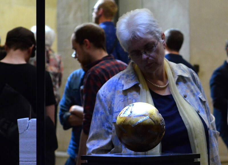 „Die Kugel“ von Robert Pollner, eine vorsichtig lasierte Holzkugel, symbolisiert den ins Rollen gekommenen Umbruch und – durch einen tiefen Riss dargestellt – die Spaltung der Kirche. Marcel Kreipes „Bildersturm“ zählt zu den interessantesten Exponaten der Ausstellung. Seine großformatigen Bilder sind als solche gar nicht zu bezeichnen, sondern durchbrechen die gewohnte Flächigkeit des Mediums durch ungewohnte Schichtungen, die aus der Bildebene heraustreten. Er fragt im „Bildersturm“ weiter, ob sich ein Bild im kollektiven Gedächtnis behauptet, auch wenn seine wesentlichen Teile entfremdet und reduziert werden. Chantal Diaz „Innere Handabrücke“ sind Gips-Formen, die Räume verkörpern, die bei verschiedenen Gebets-Formen zwischen den Händen entstehen.