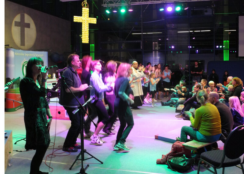 An diesem Sonntagabend wird im Balance-Bewegungszentrum der zweite ökumenische „Woanders-Gottesdienst“ im Bewegungszentrum der Eintracht Hildesheim gefeiert. Rund 350 Gäste sind der gemeinschaftlichen Einladung der evangelischen Lukaskirche und der katholischen St. Altfridkirche in Ochtersum gefolgt, um unter dem Motto „Bewegt und bewegend“ einen ungewöhnlichen Gottesdienst mitzuerleben. Und mitzugestalten:. Vor allem die jugendlichen SportlerInnen der Eintracht Hildesheim nutzten die Möglichkeit, mit Tanz- und Turneinlagen Farbe in den Gottesdienst zu bringen.