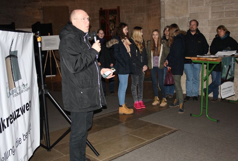 In einer kurzen Eröffnungsandacht wies Superintendent Helmut Aßmann darauf hin, wie wichtig es sei, dem Umgang mit Schmerz und Leid genügend Platz zu geben. Der Kreuzweg, der ja ursprünglich eine katholische Tradition sei und nun ökumenisch weitergeführt werde, biete dazu interessante Anstöße. Das diesjährige Motto „Das Kreuz im Fokus“ werfe für ihn die Frage auf, womit denn anvisiert werde, so Aßmann mit Blick auf aktuelle Ereignisse im nahen Osten: „Ob sich es sich um das Zielkreuz in einer Kamera handelt oder einem Gewehr, ist der Optik egal.“ Der Superintendent fügte an: „Wir können alle dankbar sein, dass wir nicht in einem Zielfernrohr erscheinen.“