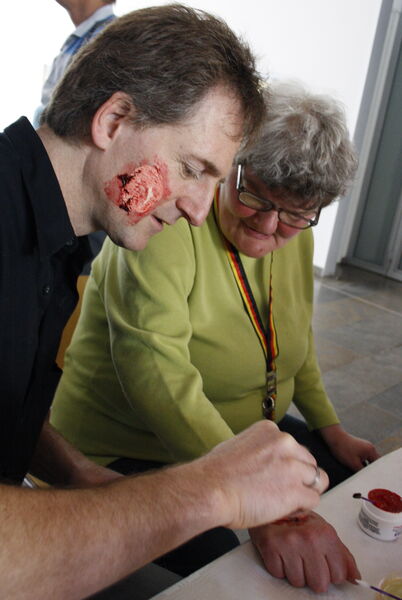 Frank Auracher vom Projekt Nordstadt.Mehr.Wert der Lebenshilfe versorgt Doris Sprenger mit einem Wundmal – und ist selbst schon gezeichnet.