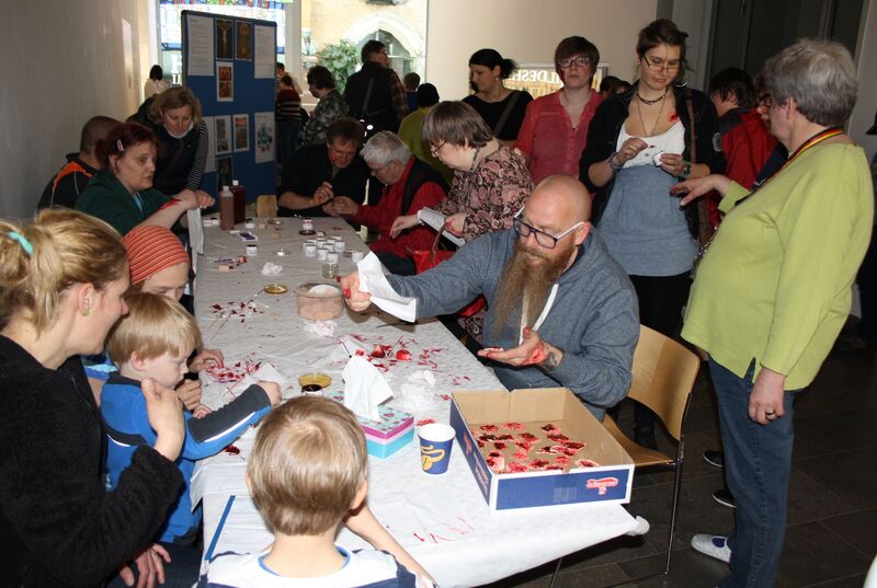 Und so entsteht an diesem Vormittag ein Wundmal nach dem anderen in den Gesichtern und auf den Armen zahlreicher Freiwilliger. Eventmanagerin Miriam Raabe hat genug Latex-Grundlagen für Stigmata vorbereitet, so dass keiner der rund 150 Gäste leer ausgehen muss. Die meisten von ihnen kommen aus der Diakonie Himmelsthür, sind Menschen mit Assistenzbedarf. Die künstlichen Wundmale stehen stellvertretend für körperliche oder seelische Verletzungen, überspitzen diese plakativ und deuten sie somit um: Jedes Stigma wird zur Toleranzbotschaft. Zum Abschluss spazieren alle Teilnehmerinnen und Teilnehmer durch die Fußgängerzone zum Hauptbahnhof. Dort werden die eigenwilligen Toleranzbotschaften beim Tag der Bahnhofsmission in Kartons verpackt und mit dem Zug durch ganz Deutschland verbreitet; „Gebrauchsanleitung für Toleranz“ inklusive.