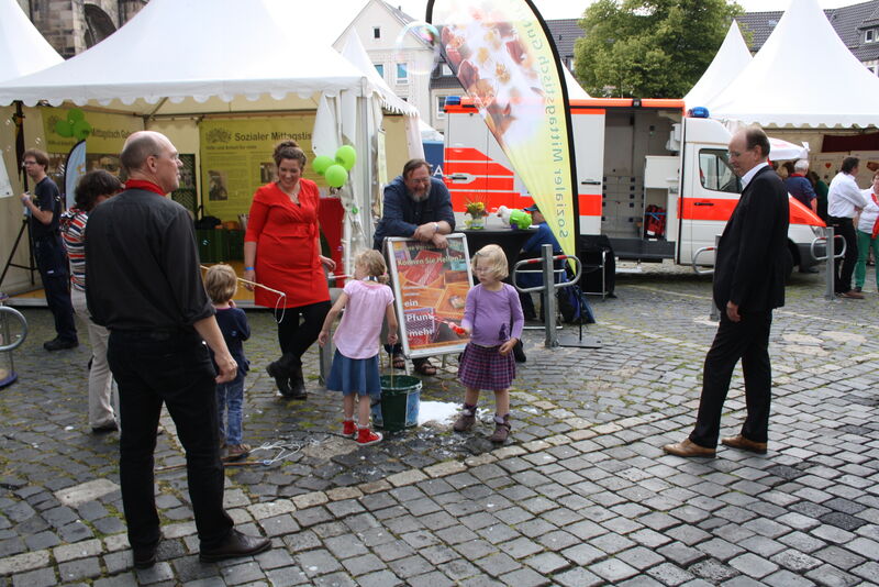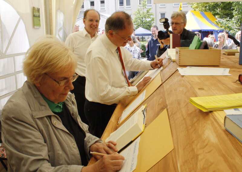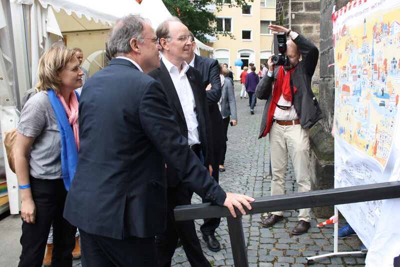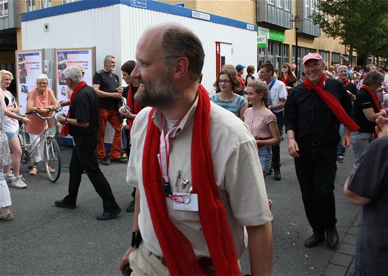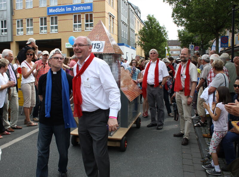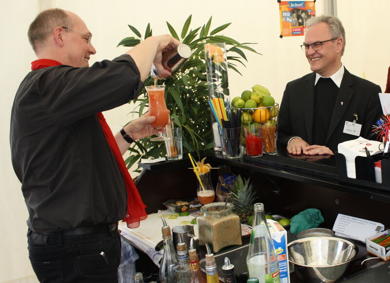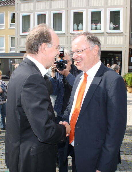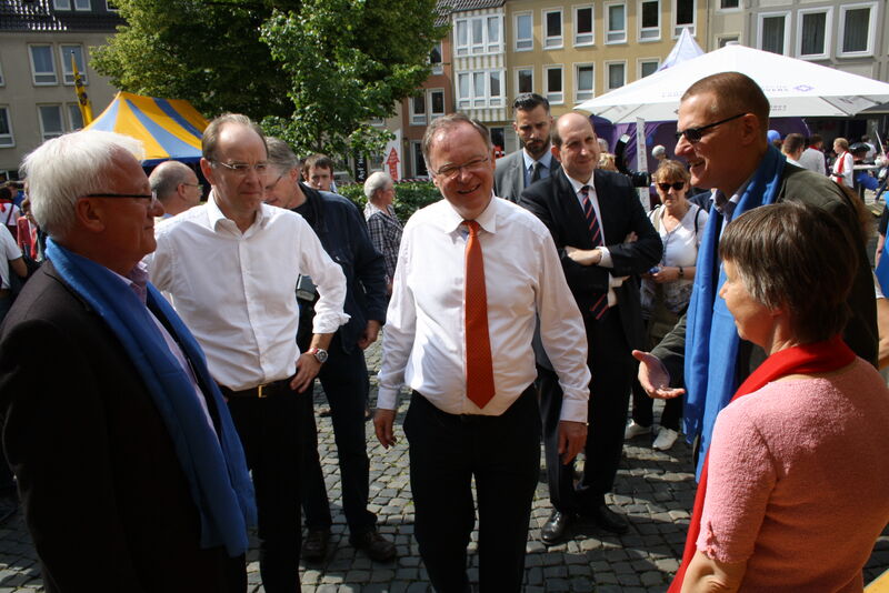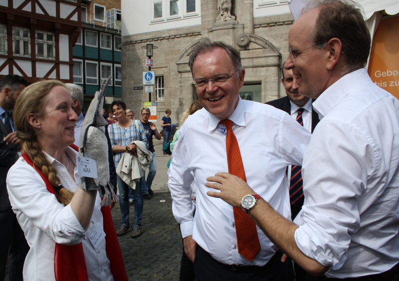 Hoher Besuch auf der Kirchenmeile an der Andreaskirche: Landesbischof Ralf Meister und Bischof Norbert Trelle zeigten Ministerpräsident Stephan Weil die Angebote der ökumenischen Zeltstadt. Hospizdienst, diakonische Arbeit, Pilgerangebote, biblisches Reisen, christliche Bildung, Spielangebote für Kinder und vieles mehr waren zu entdecken. Auch für ein kurzes Gespräch mit der evangelischen Kirchenelster Kira hatte das niedersächsische Landesoberhaupt Zeit. In der ökumenischen Cocktailbar gab es - zu dieser Tageszeit noch - alkoholfreie Drinks, mit denen sich die Sounds der lebendigen Jukebox doppelt gut genießen ließen. Am Schlusstag luden die Kirchen erst zum ökumenischen Open-Air-Gottesdienst ein, nachmittags beteiligten sie sich am traditionellen Trachtenumzug des Tages der Niedersachsen.