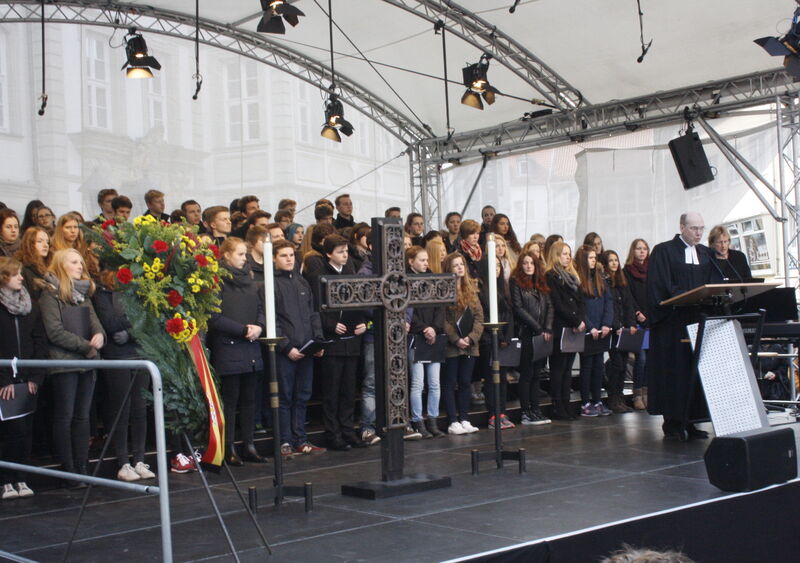 Stadtdechant Wolfgang Voges entschuldigte sich für die „Naivität“ des ökumenischen Vorbereitungsteams: Man habe gedacht, 1000 Gesangszettel würden reichen. Dass der ganze Marktplatz mit Menschen gefüllt war, wertete OB Meyer als „beeindruckendes Zeichen“. „Heute besinnen wir uns auf das unvorstellbare Leid aller Opfer des Zweiten Weltkriegs“, sagte das Stadtoberhaupt. Es gelte, aus der Vergangenheit zu lernen.