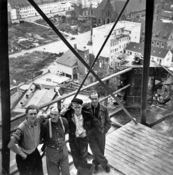 Die Dachdecker des Wiederaufbaus bei einer Arbeitspause – links Albert Uhe, der das Foto zur Verfügung gestellt hat. Foto: Privat