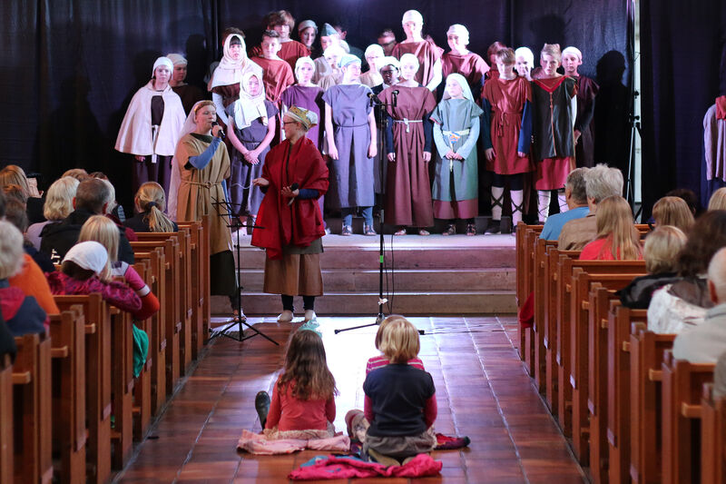 Dann geht es los. In grünen, braunen und roten Kutten betreten die Darstellerinnen und Darsteller die Bühne. Einige tragen lange Gewänder, andere Kronen oder Umhänge. Hier soll das Mittelalter dargestellt werden. Oder vielmehr eine Zeit des Mittelalters, die es so gar nicht gegeben hat. Die Idee zum Musical kam Kirchenkreiskantor Helge Metzner als er sich mit Forschungen des Historikers Heribert Illig beschäftigt hat.