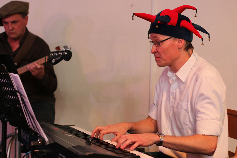 Helge Metzner als musizierender Hofnarr. Der Kirchenkreiskantor hat das Musical geschrieben und die Musik komponiert. Neben ihm Projektleiter Harald Breitenfeld.