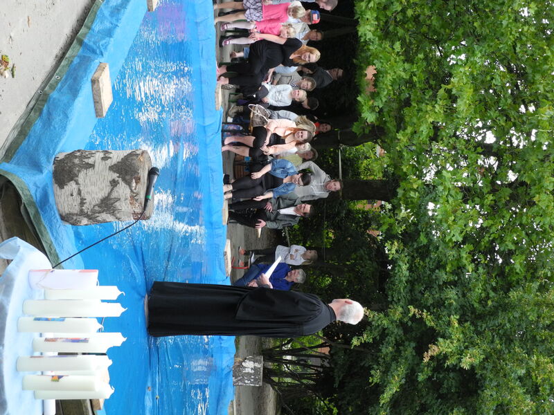 Und dann, den Talar übergestreift, Schuhe und Socken ausgezogen, stieg der Pastor in das improvisierte Taufbecken. Das Wasser reichte über die Knöchel, die Teichfolie in der Sandkiste hatte gehalten. Gott sei Dank. Und so empfingen die zwölf Täuflinge – zwischen einem und 39 Jahren alt – umringt von stolzen Eltern und PatInnen die Taufe.