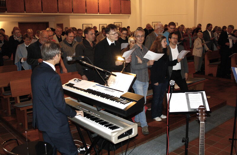 Wer richtig singen will, muss aufstehen: Mit Jochen Arnold an den Keyboards wurde die Gäste in der Auferstehungskirche zum Projektchor.