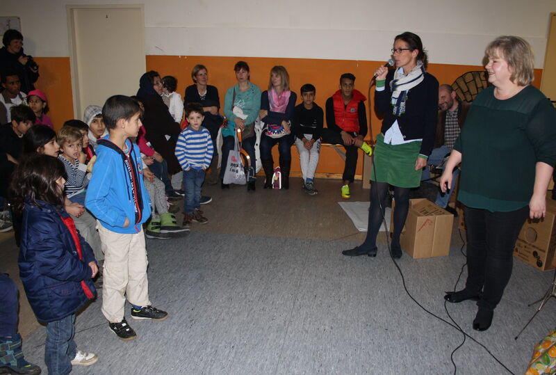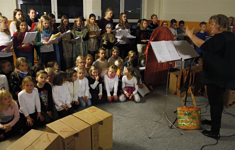 Flux hatte die Chor- und EnsembleleiterInnen der Hildesheimer Gemeinden angeschrieben, ob sie einmal pro Woche musikalische Projekte im Flüchtlingsheim anbieten würden. Viele sagten ja. Jeden Donnerstag gibt es nun Kinderchor, Theater, Percussion oder Posaunenunterricht. Eine der ChorleiterInnen, die sich ehrenamtlich engagieren, ist Swantje Krischke, die den Kinder- und Jugendchor der Katharina-von-Bora-Gemeinde betreut. Sie bot an, mit „Suleila“, dem aktuellen Itzumer Musicalprojekt, in die Nordstadt zu kommen. „Da haben wir uns gedacht: Klasse, das können wir gleich mit unserer Weihnachtsfeier verbinden“, sagt Anika Arnold von Flux.