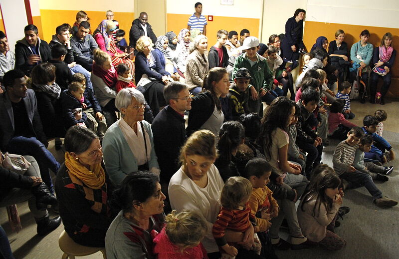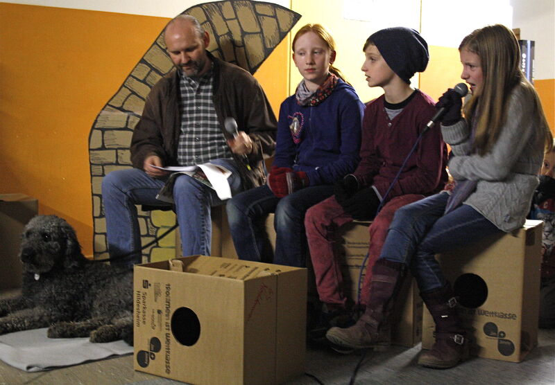 Dabei sind die Voraussetzungen etwas ungewohnt an diesem Nachmittag: Die Sprachbarriere führt zu einiger Unruhe im Publikum, manche ZuschauerInnen verlassen den Raum nach einer Weile auch wieder. Doch viele bleiben bis zum Schluss, Neugierde und Staunen spiegeln sich in den Gesichtern. Die Kinder aus den Flüchtlingsfamilien fasziniert neben der Musik vor allem der große graue Hund des obdachlosen Erzählers – eine Mischung aus Königspudel, Labrador und Golden Retriever. Einige trauen sich ganz heran und streicheln den Double Doodle sogar. Und dann ist da natürlich die Puppe, das Jesuskind: Jetzt hält es ein paar Kinder nicht mehr auf ihren Plätzen, sie müssen ganz nah heran, mitten zwischen die Sängerinnen und Sänger, und mit an der Krippe stehen.