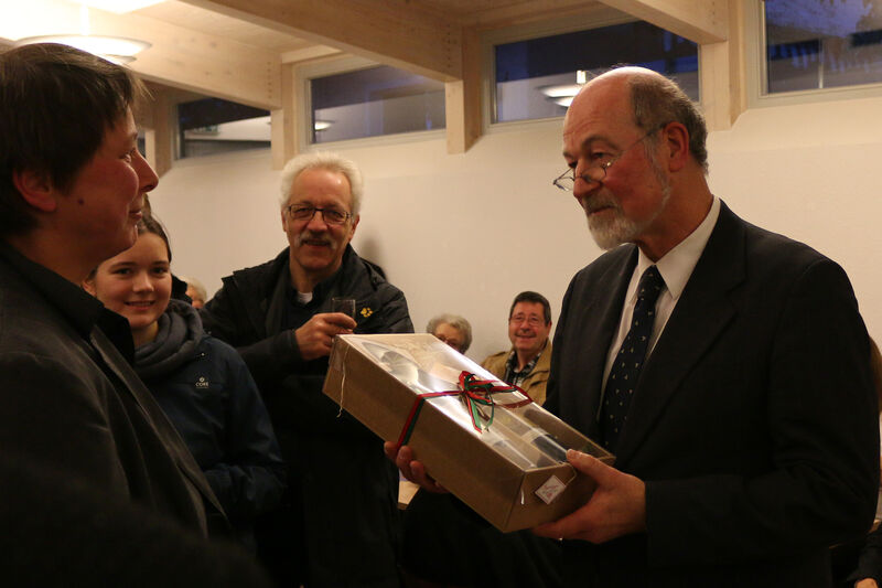 Wein statt weinen. Eines der vielen Geschenke, die Burkhard Kugelann zum Abschied geschenkt bekommt. Hier von der Jungen Kantorei Algermissen. Fotos: Möller