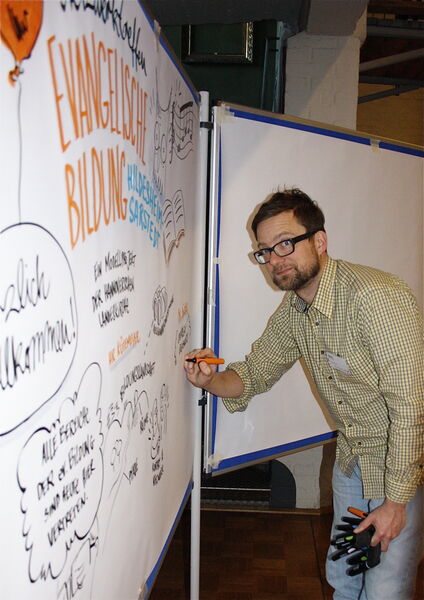 Hildesheim. „Haupt- und Ehrenamtliche aus allen Bereichen der Evangelischen Bildungsarbeit – für die Kleinsten, für Kinder und Jugendliche, für Schülerinnen und Schüler, für Familien, für Erwachsene, für Senioren“, heißt Michaela Grön willkommen. Kaum ist die Bildungskoordinatorin im Kirchenkreis Hildesheim-Sarstedt mit der Begrüßung fertig, legt Daniel Freymüller schon mit dem Edding los. Der Satz landet auf einer großen Stellwand – nach und nach umgeben von Comic-Gesichtern, Mini-Szenen, Gedankenblasen. „Graphic Recording“ nennt das Mitglied der Berliner Gruppe 123comics diese Art der Dokumentation. Das erste „Netzwerktreffen Evangelische Bildung Hildesheim-Sarstedt“, dafür ist schon mal gesorgt, wird bleibende Eindrücke hinterlassen.
