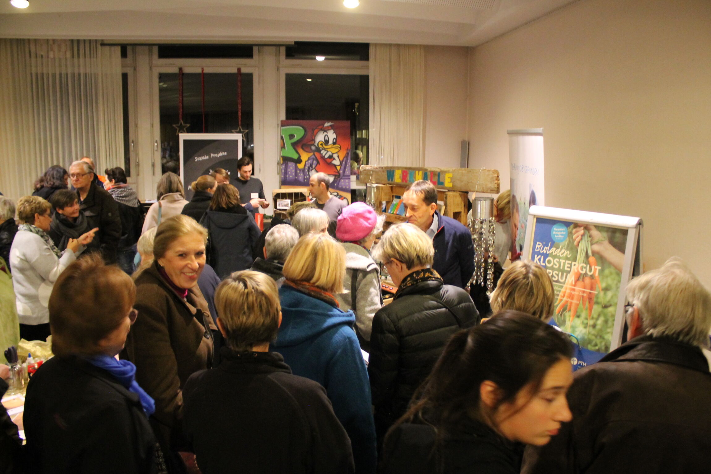 Im Anschluss an den Vortrag stellten sich 30 Projekte und Initiativen zu öko-fairem Einkauf und Bildung kurz vor. Darunter waren sowohl regionale Anbieter wie der Weltladen/El Puente, die Diakonie Himmelsthür, die Klimaschutzagentur Hildesheim-Peine oder das StadtLABOR als auch überregionale Initiativen wie Kirchliche Entwicklungsdienst und die Cusanus Hochschule. Danach hatten die BesucherInnen die Möglichkeit sich auf dem „Marktplatz, öko, fair und mehr“ an den Ständen der Initiativen im Gemeindehaus tiefgehender über deren Angebote zu informieren.