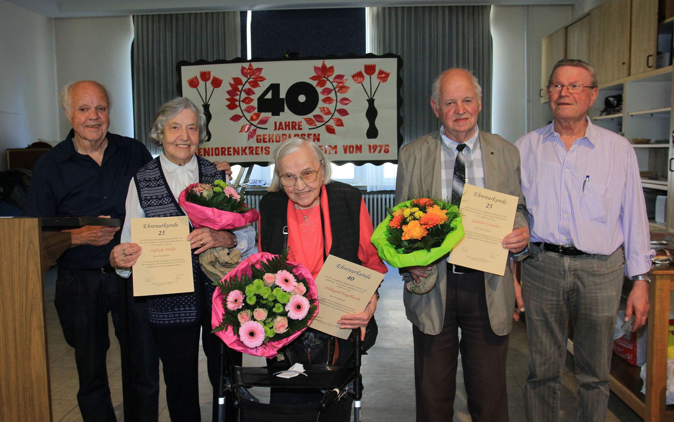Heinz Schröder (ganz links) und Vorsitzender Helmut Rath (ganz rechts) zeichnen für langjährige Mitgliedschaft Siglinde Müller, Hildegard Engelbrecht und Günther Schreiber aus (v.l.n.r.).