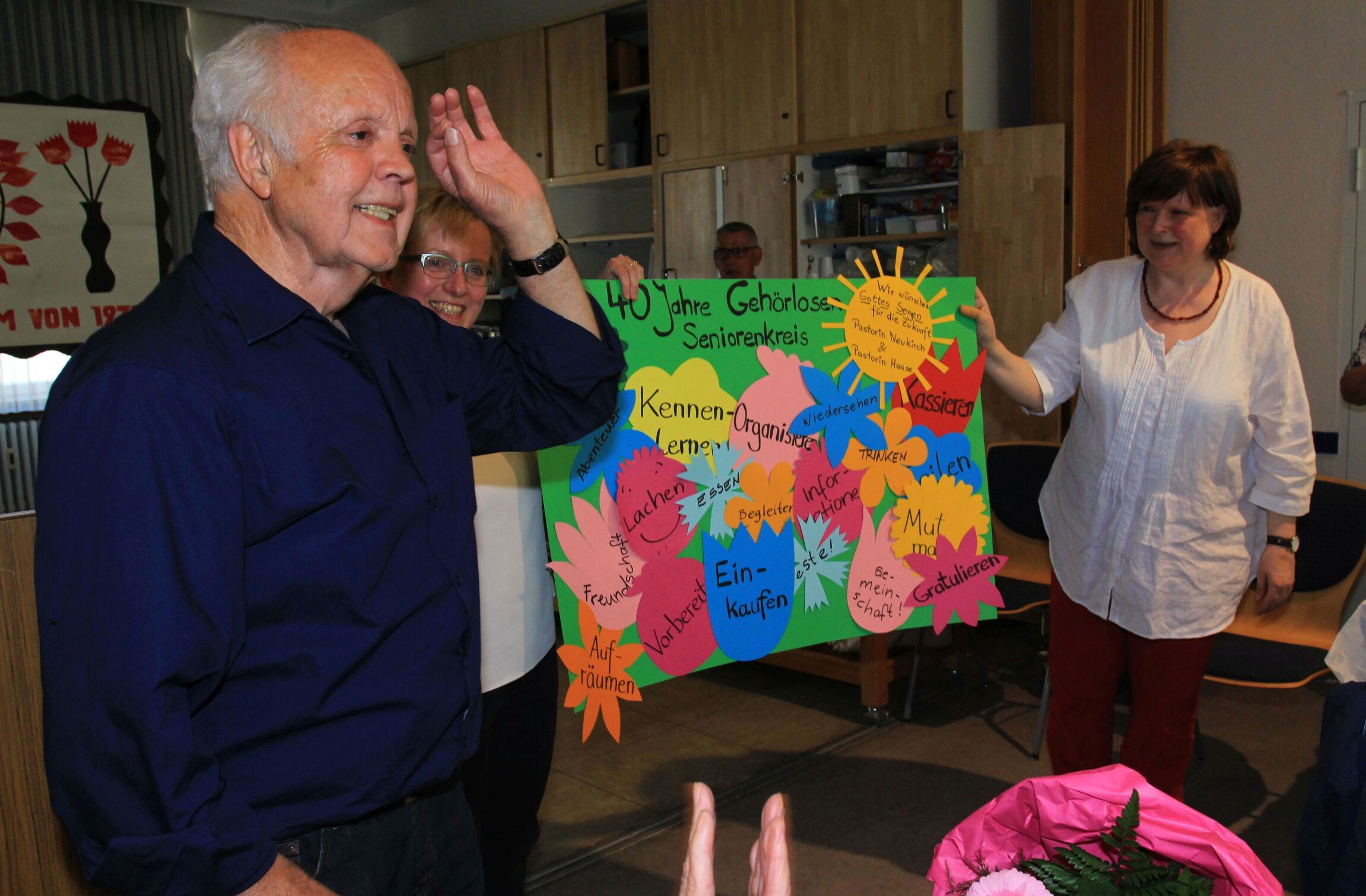 "Die schönste Aktivität ist nach wie vor die gelebte Gemeinschaft, der Austausch zusammen und die Möglichkeit, in Gebärdensprache miteinander zu sprechen," fasst Schröder zusammen. Dieser Kontakt im Seniorenkreis sei ganz wichtig, betonen Andrea Haase, Pastorin und gebärdensprachliche Seelsorgerin der Evangelisch-lutherischen Landeskirche Hannover und Pastorin Christiane Neukirch, landeskirchliche Beauftragte für gebärdensprachliche Seelsorge. Viele der älteren Gehörlosen hätten es meist schwerer als die Hörenden, wegen der seltenen Kommunikationsgelegenheiten würden sie oft vereinzeln und vereinsamen. Beide Pastorinnen kennen den Seniorenkreis seit langer Zeit, betreuen und unterstützen die Mitglieder, in auch oft nicht einfachen Zeiten. Dafür bedankt sich der Seniorenkreis mit viel Applaus. Schröder erinnert auch an den schon verstorbenen Landeskirchenseelsorger Pastor Peter Boes, und die große Unterstützung durch ihn und seine Frau Renate Boes, die unter den Ehrengästen sitzt.