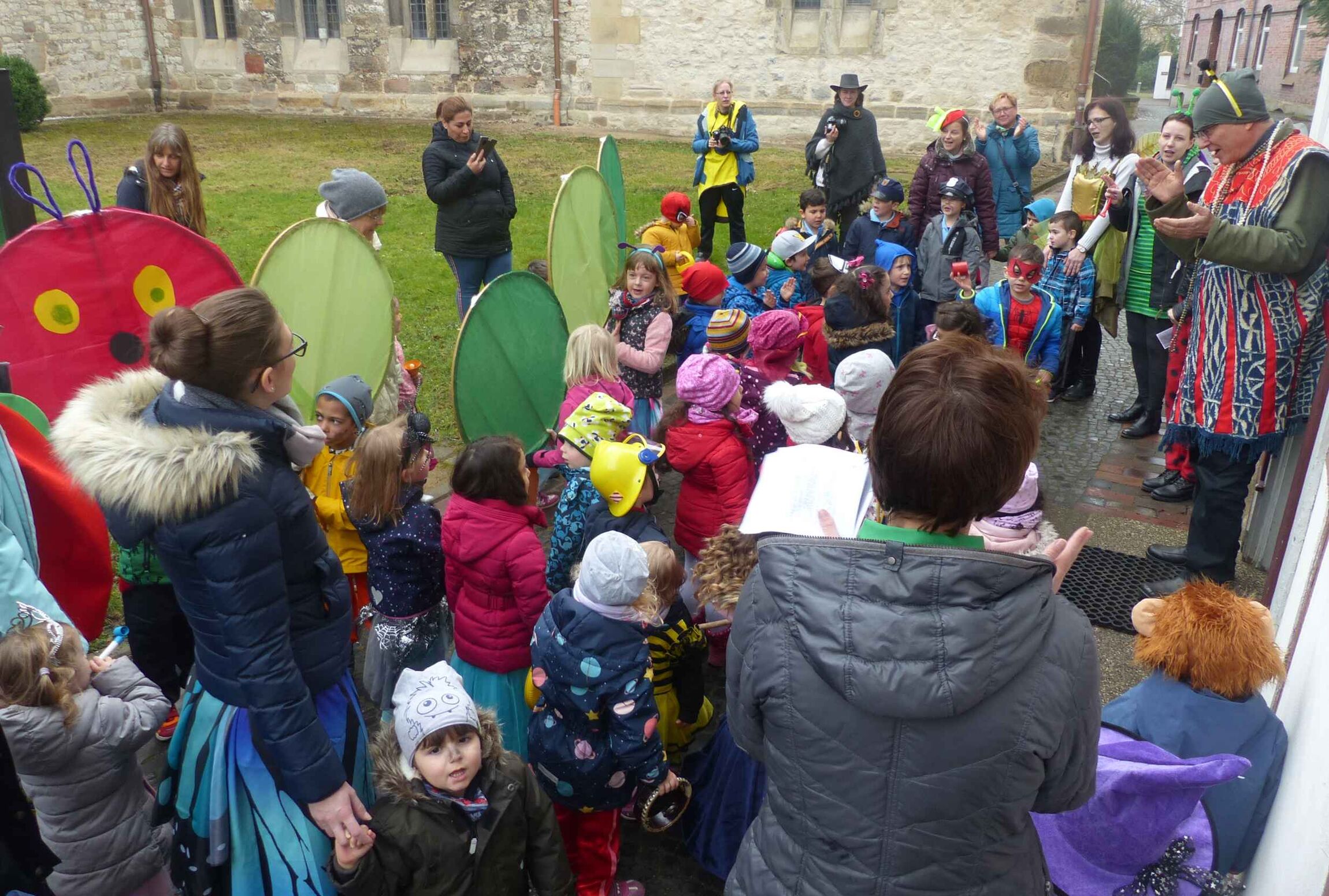 Den Höhepunkt der Festivität bildete dann wie immer der lautstarke Umzug am späten Vormittag. Mit Schellen und Glocken zogen die Kinder zum Pfarrhaus. Dort begrüßte Pfarrer Matthias Fricke-Zieseniß die bunte Schar, darunter die verschiedensten Käfer, Schmetterlinge, Bienchen und sonstigen Fühlerträger, sowie der obligatorische Mini-Spiderman, ein Polizist, mehrere Prinzessinnen und eine lecker aussehende Geburtstagstorte inklusive Kerzen am Hut. Auch Fricke-Zieseniß hatte sich wie immer zu dieser Gelegenheit in ein eher unkonventionelles Gewand gekleidet, auf dem Kopf krönten den Umhang des „Wiesenschneckenkönigs“ zwei wippende Fühler. Und Küsterin Sylvia Soller kam gleich ganz als schillernde, geflügelte Waldelfe.
