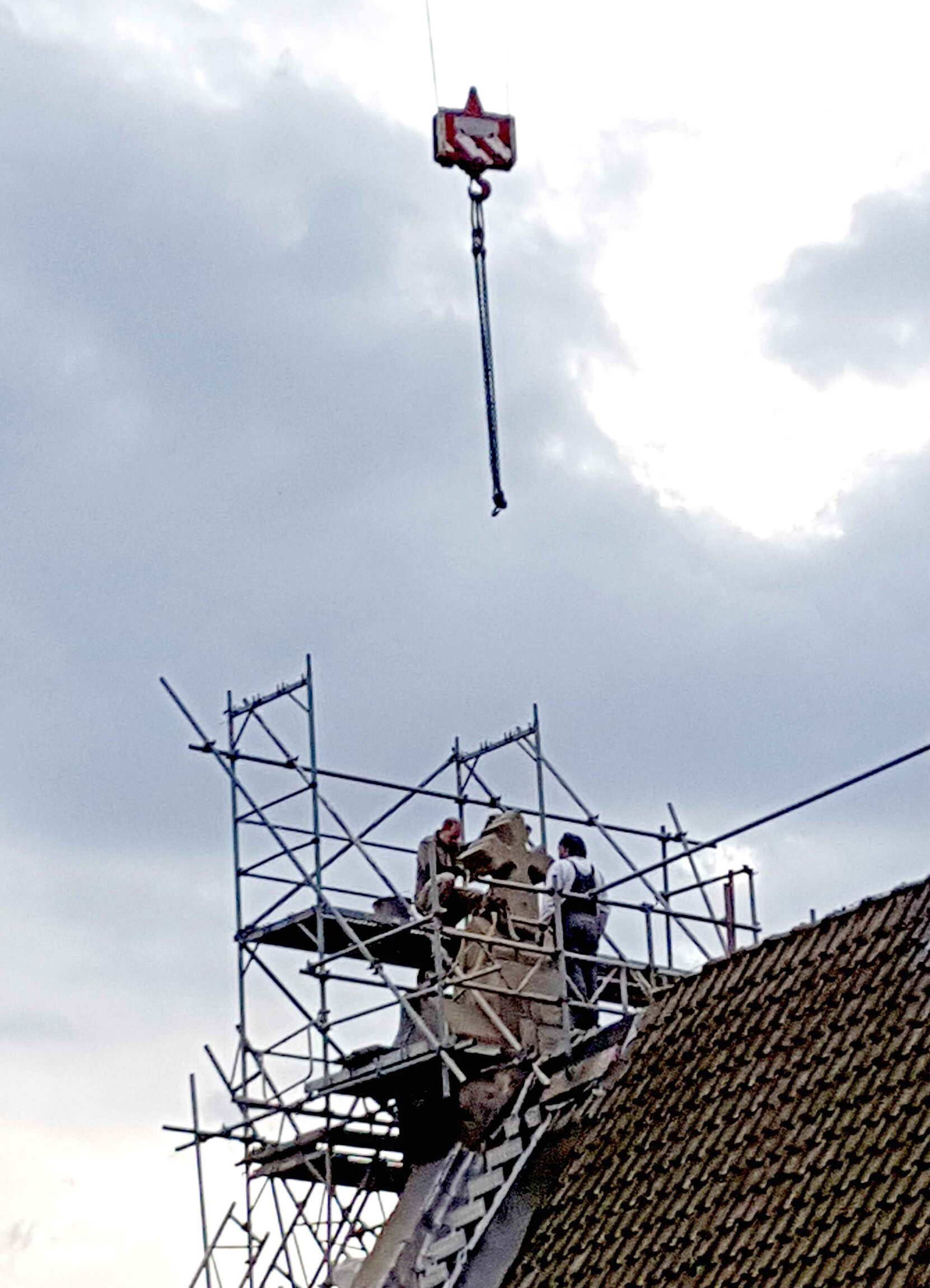 Dafür war das Kreuz Mitte September abgenommen worden. Nun konnte am 21. Oktober der Kran wiederkommen und das kalksteinharte Kreuz wieder auf den östlichen Dachgiebel des Hauptschiffes setzen - auf den restaurierten und nun wieder stabilen Sockel.