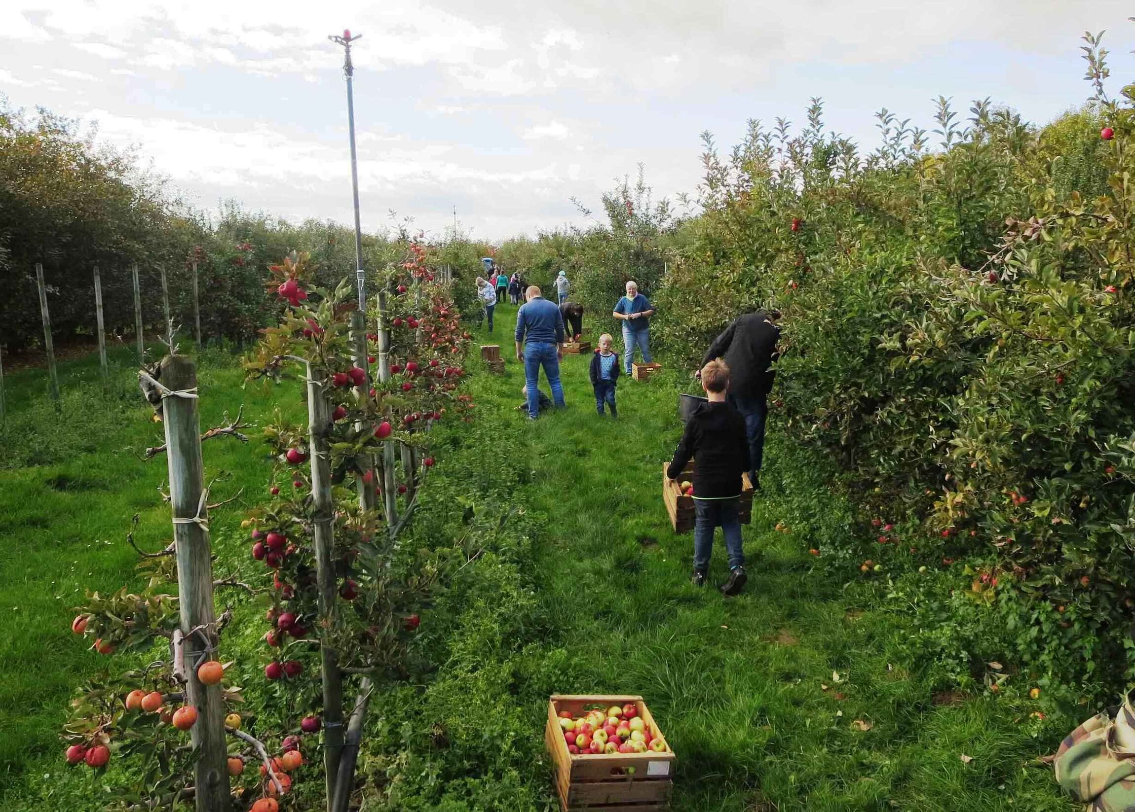 Drei Gruppen pflücken für den guten Zweck. Die vielen Kinder, die um Gritlis Rowel, Diakonin des Ev.-luth. Gemeindeverbunds Sarstedt herumspringen, sind Zwischenzeitkonfirmanden aus Gemeinden. Ihre Ernte wird zu „Orgelsaft“ verarbeitet, mit dessen Erlös die neue Orgel sowie weitere „Baustellen“ in der St. Nikolai-Gemeinde Heisede-Ruthe finanziert werden.