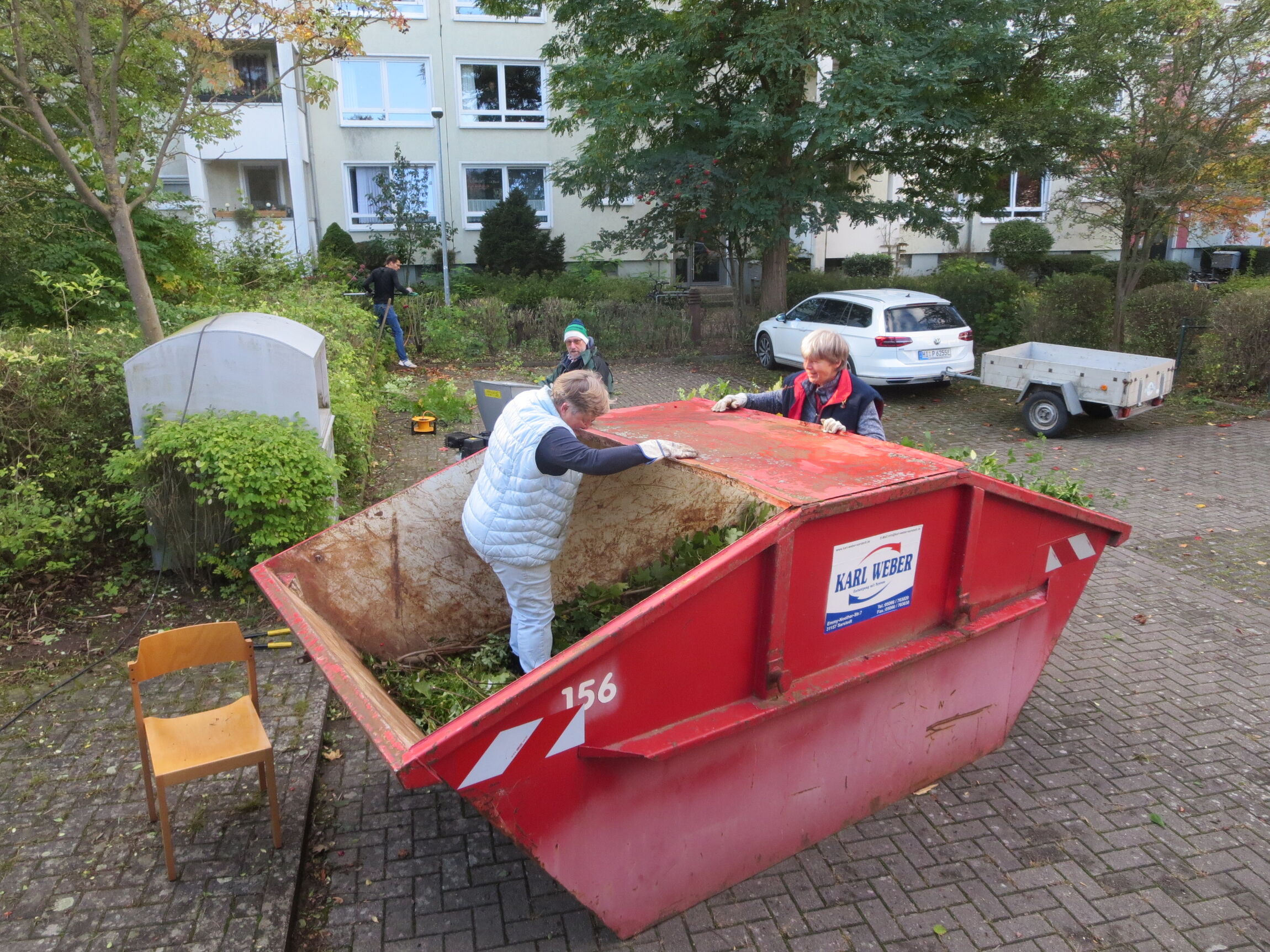 Kirchenvorsteher Gunter Limmeroth schob ausdauernd Astwerk durch den Häcksler und Kirchenvorsteherin Christine Höppner und Pastorin Schiwek stiegen immer wieder in den großen Container auf dem Parkplatz, um das Schnittgut zu verdichten, damit möglichst viel Grünzeug untergebracht werden konnte. In Gemeinschaft ging die Arbeit flott von der Hand. Und nebenbei ist die Bewegung an frischer Luft natürlich auch noch gesund und macht Spaß, wenn man sieht, wie etwas gut wird. Christina Steffani-Böringer