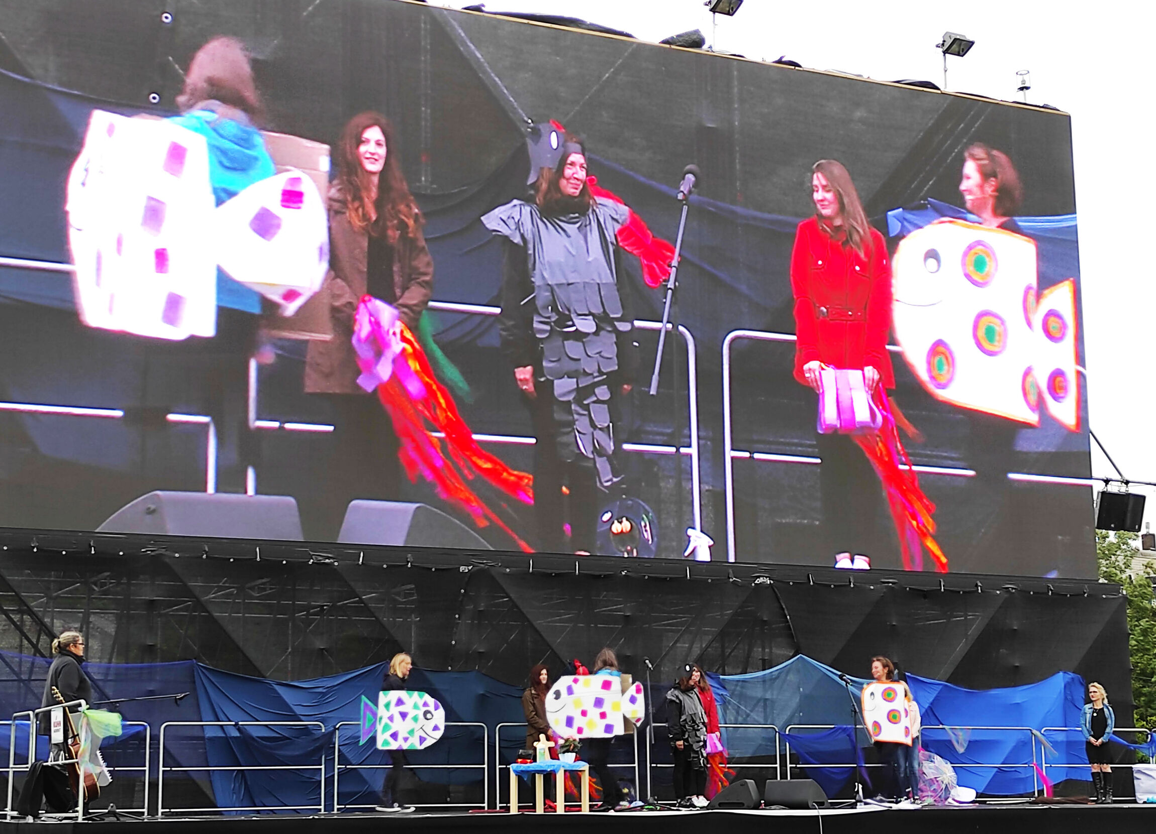 Live auf der großen Bühne und gleichzeitig auf der LED-Wand für alle gut sichtbar spielte das Kita-Team Leo Lionnis Geschichte von Swimmy, in der die ganz kleinen Fische den Großen trotzen können, weil sie zusammenhalten. Und auch wenn Swimmy anders aussieht als die anderen Fischchen, ist er im Schwarm am richtigen Platz.