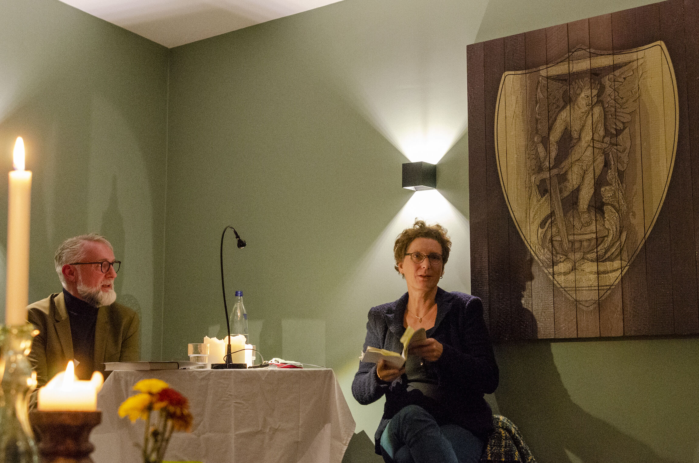 In behaglicher Salonatmosphäre entfaltet Pehnts Prosa einen Sog, der die Zuhörenden mitnimmt in das China-ähnliche Fantasieland Kirthan. Der Roman beginnt in den Köpfen einer europäischen Reisegruppe, springt aber alsbald über in unbekanntere Gedankenwelten, wie die des einheimischen Reiseleiters oder gar der Lehrerin eines Dorfes, das mittlerweile einer Talsperre weichen musste. Die einstündige Lesung mit Gespräch vergeht wie im Flug.