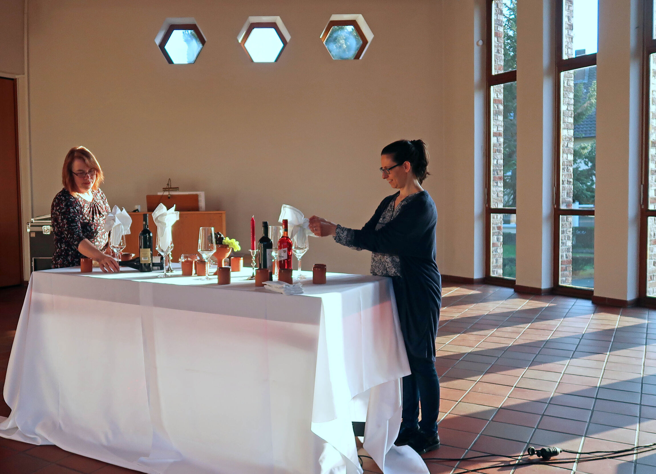 Das Abendmahl erinnere nicht nur an das letzte gemeinsame Essen Jesu mit seinen Jüngern, erklärt Pastorin Carola Bachstein. Es sei auch ein Hinweis auf das Festmahl, mit dem Christus das Himmelreich vergleicht. Der gedeckte Tisch sei außerdem ein Bild für die Fülle des Lebens, die Gott den Menschen schenkt. All das soll in dem Arrangement auf dem Altartisch angedeutet werden, weshalb nicht nur die schlichten Abendmahlsbecher darauf stehen, sondern auch langstielige Gläser mit weißen Servietten und heutige Weinflaschen.