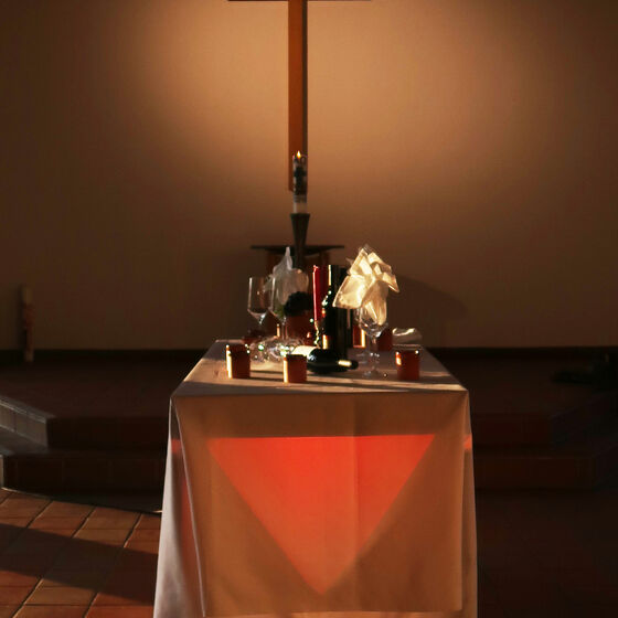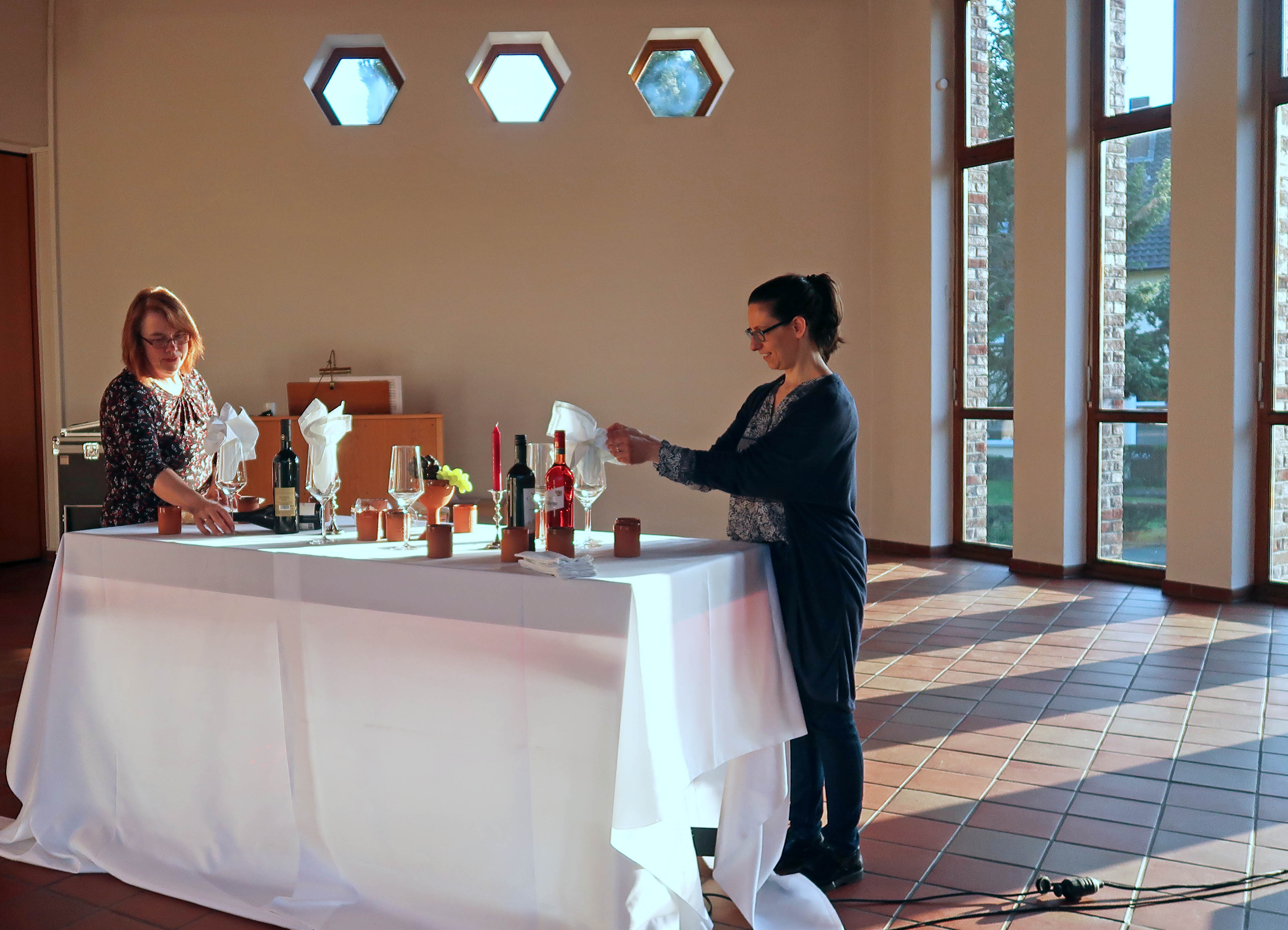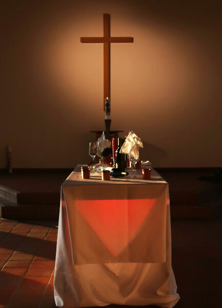 Pastorin Carola Bachstein hat zusammen mit Petra Schäfer, Sören Sommer und Bastian Wegener aus dem Kirchenvorstand ein festliches Bild gestaltet. Der Altartisch wurde von seinem angestammten Platz fort in die Mitte des Raumes gerückt, die Stühle sind weggeräumt. Auf dem Altar haben die Beteiligten einen festlich gedeckten Tisch arrangiert: Becher und Gläser, Weinflaschen und Servietten, Brot und ein Abendmahlskelch mit Trauben. Das Bild soll das Thema des Gründonnerstag sichtbar machen und an das letzte Abendmahl erinnern. Am Donnerstagabend wird die Szene dann noch farbig ausgeleuchtet, um eine besondere Atmosphäre zu schaffen. Wer dann einen Spaziergang zur Kirche unternimmt, kann im Vorübergehen aus verschiedenen Blickwinkeln auf das Bild schauen.