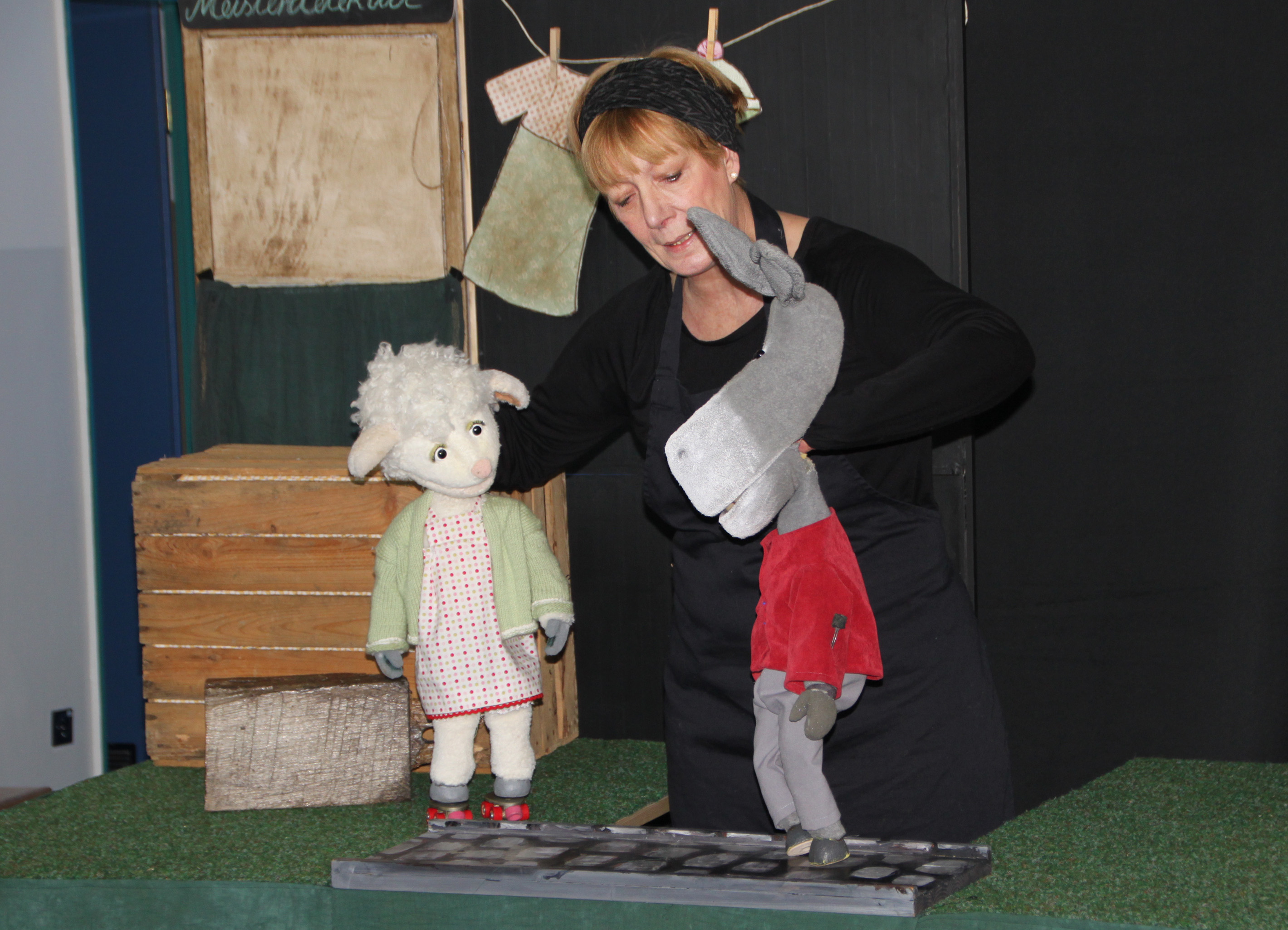 Petra Albersmann brachte ihre Tischbühne und das Figurentheater-Stück „Der Rollschuhdieb“ mit in die Sporthalle der Kita. Die Geschichte handelt von Schaf Sissi und ihrem besten Freund, dem Esel Robert. Nachdem Sissi die heiß erwünschten Rollschuhe geschenkt bekommen hat, hat sie keine Zeit mehr für Robert. Dann sind die Rollschuhe weg, Sissi ist unglücklich, Robert dann auch, und die Meisterdetektive Fuchs und Hase müssen ermitteln.